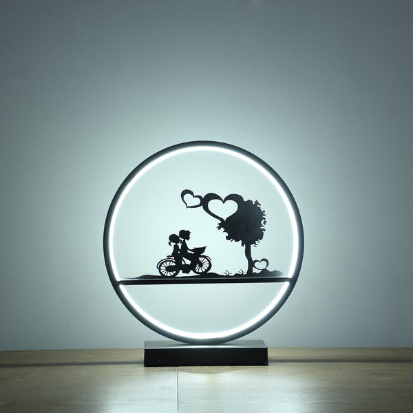 This 13” Kids On A Bicycle Table Lamp With LED Light is a beautiful light hearted piece that is perfect as a lamp for any room in your home or as a gift to a loved one or special person. It is a round lamp sitting upright on a rectangular metal base. The lamp has a light blue color that adds to its beauty. On the lamp itself, there is a design of a young girl and boy riding on a bicycle towards a tree decorated with hearts. It depicts young, sweet love or the love of a brother and sister that warms your heart. You can also place this lamp in your bedroom, living room, or dining room. 13” x 4” x 11.75”