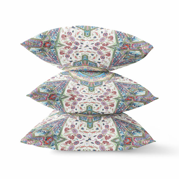 Wrapped in modern elegance with a bohemian flair, this Cream Pink Boho Flower Indoor Outdoor Zippered Throw Pillow is sure to spruce up your living space with its eclectic pattern and palette. The intriguing floral medallion in shades of aqua blue, pastel pink, green, and cream make this spectacular piece of décor one-of-a-kind in the room. . Made of soft but premium quality broadcloth fabric, it is not only durable to use in indoor and outdoor settings but also ideal for everyday usage while maintaining its colorization. The soft polyester fill insert gives it a luxurious plush look and offers ultimate comfort. Featuring a seamless zipper and removable cover, its cleaning process is trouble-free. If you want a subtle yet eye-catching element in your living room, opt for this lovely throw pillow that’s suitable for a range of modern, contemporary, and traditional décor. 16” x 16” x 5”