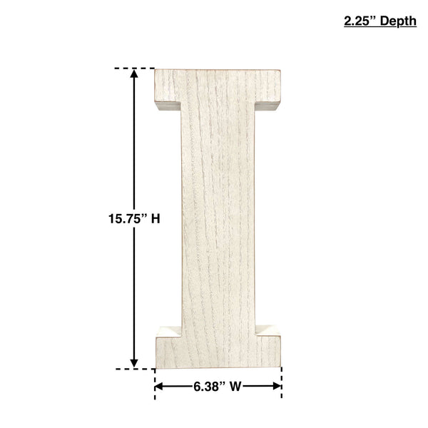Add some personalization to your space with this Distressed White Wash Wooden Initial Letter Sculpture. Large in size, the 15.75"h letter can be a great accent to your living room, kitchen, entrance foyer, children's bedroom and more. Use to spell out a monogram or create a word to add some creative and special decor to your room. Crafted from MDF in a natural rustic and distressed white finish, the letter can be used as is, re-painted a different color, or stained, making it a fun option for a DIY craft project. Comes ready to hang but is also designed to be free standing to sit on a table, ledge, mantel, dresser, desk or bookshelf. 15.8" x 6.4" x 2.3"