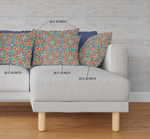 Enliven your living space with this stunning Orange Green Cloverleaf Boho Suede Throw Pillow that features a palette of colorful hues to bring a bohemian essence to your home. The intriguing cloverleaf-like patterns exhibit vibrant shades of warm reds and oranges with cool blue and jade tones to strike a perfect balance. This blown pillow is crafted from premium-quality suede fabric which is characterized by its soft and smooth surface texture for a delicate feel. The plush look and fluffy nature come from the regular polyfill insert that provides a comfortable platform for your head and neck to maximize relaxation. Make your living space look and feel more welcoming with this beautiful decorative pillow thatâs meant to add colors to your interior décor. 16â x 16â x 5â