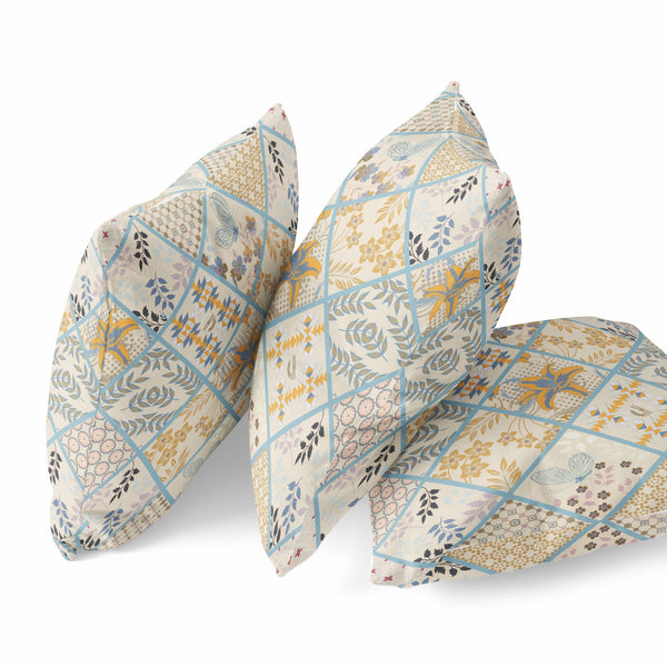 Make your living space look and feel happy with this Gold Cream Patch Indoor Outdoor Throw Pillow that features a blend of warm and cool tones to strike a perfect balance of color and contrast in the room. The ivory white patches are neatly outlined and embellished with sky blue borders and floral patterns in gold, gray, and blue for visual interest. Made from top-notch broadcloth fabric for a soft yet durable construction, making the pillow a decorative and practical accent for indoors and out. This blown and closed pillow is finished to perfection with a soft and durable polyfill insert for a fluffy appearance, making it an ideal accent piece in terms of fashion and functionality. This soft and cozy decorative pillow will indeed be an element of style and comfort in your boho-chic home. 16” x 16” x 5”