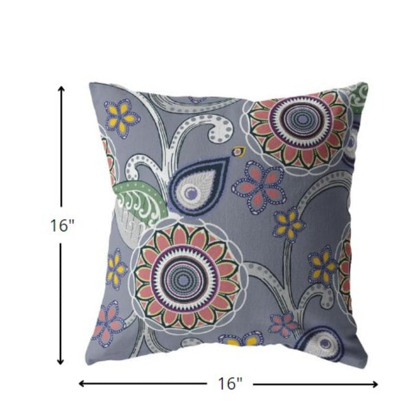 The artistic flair and sophisticated palette of this Gray Pink Floral Indoor Outdoor Zippered Throw Pillow will instantly uplift your living space with its visual elegance. Flaunting a pewter gray base with cheerful floral vines in mauve pink, blue, green, and yellow, this decorative pillow is sure to enhance the aesthetics of your boho-chic décor. Incorporating high-quality broadcloth fabric in its making, this pillow ensures optimum durability with a soft and smooth surface texture which is ideal for both indoor and outdoor settings. This pillow is blown and closed with a soft polyfill insert for a plush feel on the touch while making this pillow luxuriously fluffy to rest your head on it. It also comes with a neatly finished zipper cover which is easy to remove for hassle-free cleaning. The cozy feel and aesthetic beauty of this throw pillow make it a worthy piece of décor to add style and comfort to your living room. 16â x 16â x 5â