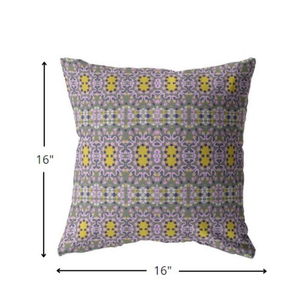 The intricacy of the patterns and vibrancy of the palette in this Purple Yellow Geofloral Indoor Outdoor Zippered Throw Pillow is sure to add a feeling of cheerfulness to your living space with a bohemian flair. The floral patterns in pale purple and mustard yellow are geometrically fashioned over a sage green backdrop, making this pillow an eye-catching accent to adorn your boho-chic home. Made from premium quality broadcloth to ensure longevity and softness, this decorative pillow is an ideal accent for both indoor and outdoor scenarios. The super-soft polyfill insert provides a cozy and inviting feel to ensure the most relaxing experience when you rest on it. It also comes with an in-built zipper to remove the cover with ease. Bring an outstanding lavishness and spectacular vibe into your living room with this colorful decorative throw pillow. 16â x 16â x 5â