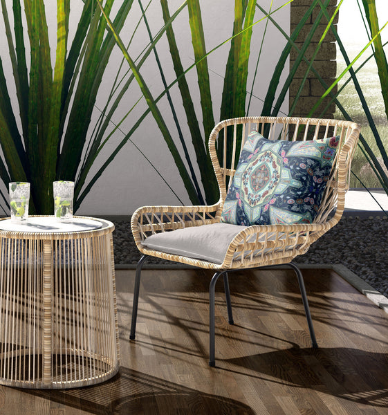 Bring home the colors of the ocean with this exquisite Aqua Blue Boho Pattern Indoor Outdoor Throw Pillow that will induce a calm and comforting atmosphere into your living room. Flaunting an eye-catching floral medallion in shades of aqua blue with hints of mauve, pink, and white for a visually appealing design that’s sure to draw attention. Crafted from the finest broadcloth fabric to ensure durability with a soft hand, it is an ideal accent to add a luxurious look to your indoor and outdoor settings. This blown and closed pillow with a polyfill insert gives it a lavish springy feel with a fluffy nature to provide utmost comfort. The clean look of the high-quality print is made to last for years on end, while maintaining its color intensity for ages.. The beautiful balance of soft and bold hues in this decorative throw pillow makes it a classy addition to any boho-chic home. 18” x 18” x 5”