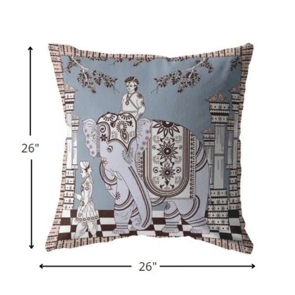 Make a statement in your bohemian living space with this stunning Blue Brown Ornate Elephant Indoor Outdoor Throw Pillow that features eye-catching traditional art in a sophisticated palette. The spectacular decorative detailing of the elephant, human figures, and the palace in deep brown and slate blue makes this pillow a piece of art to behold. This blown pillow is crafted with topnotch broadcloth fabric, which is sturdy yet soft to the touch with a silky smooth surface texture, making it a great decorative and practical accent for indoor and outdoor settings. The soft and fluffy nature comes from the regular polyfill insert that provides a comfortable platform for your head and neck to maximize relaxation. Bring home this exquisite throw pillow that exhibits a fine fusion of traditional charm and modern grace to spruce up your boho-chic living space. 18” x 18” x 5”