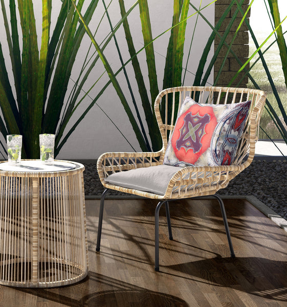 The intense colors against the traditional print of this eye-catching Gray Peach Geo Tribal Indoor Outdoor Throw Pillow make it the ideal décor piece to induce a boho-chic vibe into your home. The curved gray strokes over a distressed white base lays a perfect foundation to flaunt the central shape in peach that holds an enchanting plum-toned tribal motif for visual intrigue. Ideal for indoor and outdoor settings, this decorative pillow is skillfully crafted from premium quality broadcloth fabric to ensure a sturdy construction with a soft hand. This blown and closed pillow features a soft polyfill insert that adds to the fluffy nature while maximizing warmth and comfort. Give your living room an alluring tribal aesthetic with this stunning decorative throw pillow flaunted amidst your modern or bohemian décor. 18” x 18” x 5”
