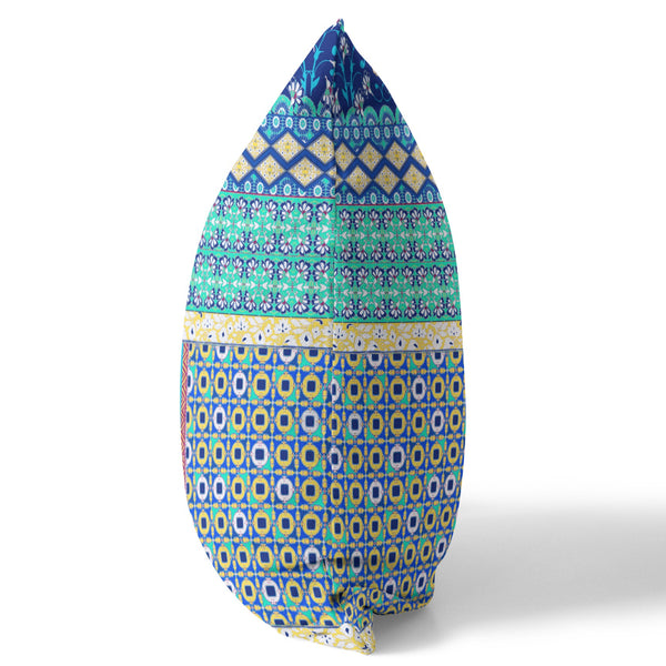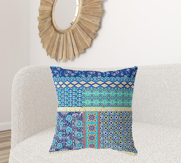The calm and soothing hues of this Navy Blue Yellow Patch Indoor Outdoor Throw Pillow will evoke a sense of serenity in the air while being a functional piece of decor in the living room. Inspired by bohemian patterns and on-trend palette, this pillow boasts an array of decorative patchwork in azure blue, cyan, and yellow to accentuate a boho-chic appeal. Crafted from high-quality broadcloth fabric, this pillow ensures a smooth and luxurious surface texture with enhanced durability, making it an ideal accent piece for indoor and outdoor settings. This blown and closed pillow features a soft polyfill insert that adds to the fluffy look while maximizing warmth and comfort. Combining modern elegance with bohemian charm, this decorative pillow is sure to take your interior decor to the next level in this era of fusion fashion. 18" x 18" x 5"
