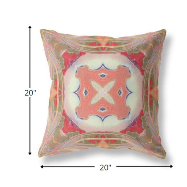 Melding a classic pattern with jovial colors, this Peach Green Geo Tribal Indoor Outdoor Throw Pillow can spruce up your living room in an instant with a bohemian flair. The captivating center motif in white and peach sits snug in an intense angled silhouette of contrasting green and red hues for subtle yet captivating visual aesthetic. Crafted with premium broadcloth fabric, this piece ensures that you get the best quality in terms of looks and comfort. This blown and closed pillow features a soft and fluffy polyfill insert, perfect for indoor and outdoor spaces. Infuse the grace and elegance of the bohemian style into your home and let it enhance your contemporary décor with its tribal influences. 18” x 18” x 5”