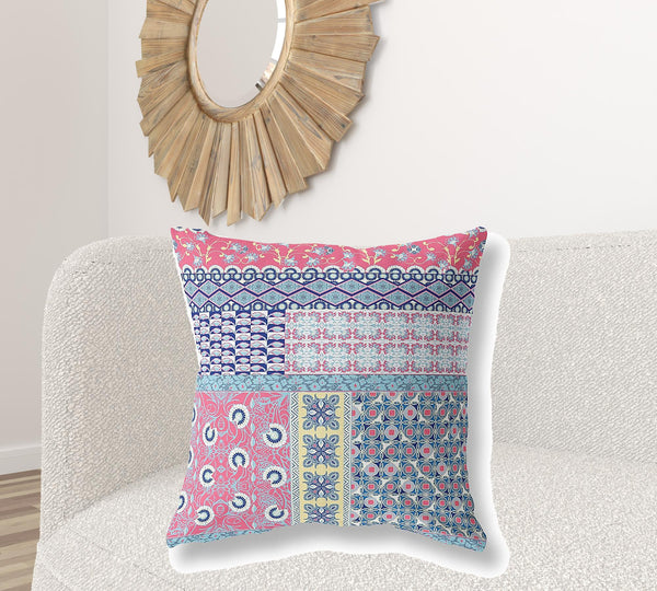 Emphasizing a boho-chic vibe in its decorative detailing, this Pink Teal Patch Indoor Outdoor Throw Pillow will add a feeling of refreshment and cheerfulness to your interior while accentuating a contemporary flair. The intricately embellished floral and geometric design in salmon pink, blue, white, and pale yellow makes this pillow a spectacular piece of decor to adorn your living room. This decorative throw pillow is made of premium quality broadcloth fabric for long-lasting durability with a soft and smooth surface texture, ideal for indoor and outdoor settings. The soft polyfill insert imparts optimal comfort with a plush and fluffy look. Redefine your interior look with this cool-toned decorative throw pillow that stands out in fashion and functionality. 18" x 18" x 5"