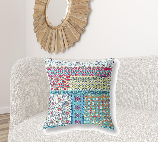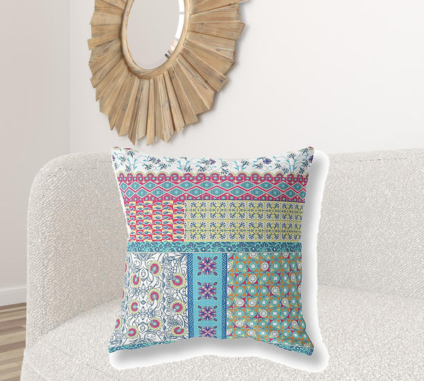 Enliven your living space with pops of colors and eye-catching patterns with this White Yellow Patch Indoor Outdoor Throw Pillow. Showing off beautiful patchwork in eclectic floral and geometric patterns, this pillow creates a stunning combination of cool-toned cyan, pink, and white with warm yellow to give this pillow a playful vibe. Made from premium quality broadcloth fabric that is known for its durability to last long, while the smooth and plush texture offers a characteristic sheen. This blown and closed pillow is finished to perfection with a soft polyfill insert, making it ideal for outdoor and indoor use while maximizing comfort. Enhance the aesthetics of your boho-chic living space with this alluring decorative pillow flaunted on the sofa or couch. 18" x 18" x 5"