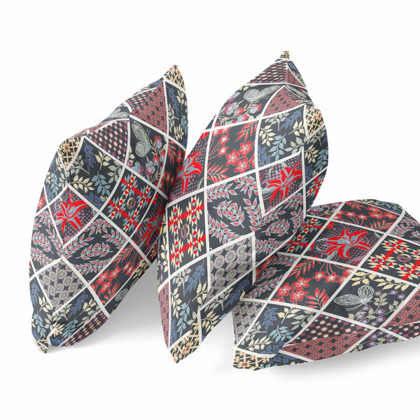 Set an inviting tone into your home with this visually contrasting Black Red Patch Indoor Outdoor Throw Pillow. Featuring finely segmented black patches with floral intricacy in red, blue, and yellow to create a spectacular piece of décor perfect for any modern or bohemian ensemble. Crafted from high-quality broadcloth fabric which is smooth and glossy to give a plush appearance to the pillow while being durable to last for a long time. Ideal for indoor and outdoor settings, this blown pillow features a soft polyfill insert that makes it super soft and cozy to rest your head or support your back for maximum comfort. The bold and bright hues of this decorative pillow will be an element of fashion and function on the bed, sofa, or couch. 18” x 18” x 5”