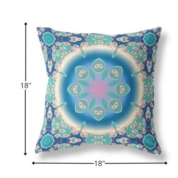 Fusing jewel tones with the intricacy of circular patterns, this Blue Turquoise Jewel Indoor Outdoor Zippered Throw Pillow is a treat to the eyes of any homeowner. The turquoise shard-like almost floral motifs at the outermost edge slowly creeping into the burst of blue and pink at the very center create a mesmerizing visual on this decorative throw pillow. With top-notch broadcloth fabric in the construction, this pillow is made to last for a long time while offering a soft and smooth surface texture. The high-quality polyfill insert makes the pillow super soft and cozy with fluffy nature to maximize comfort while the perfectly finished zipper makes the cover easy to take off for washing. The alluring patterns of this pillow make it the perfect focal point to define the contemporary features of your home. 18â x 18â x 5â