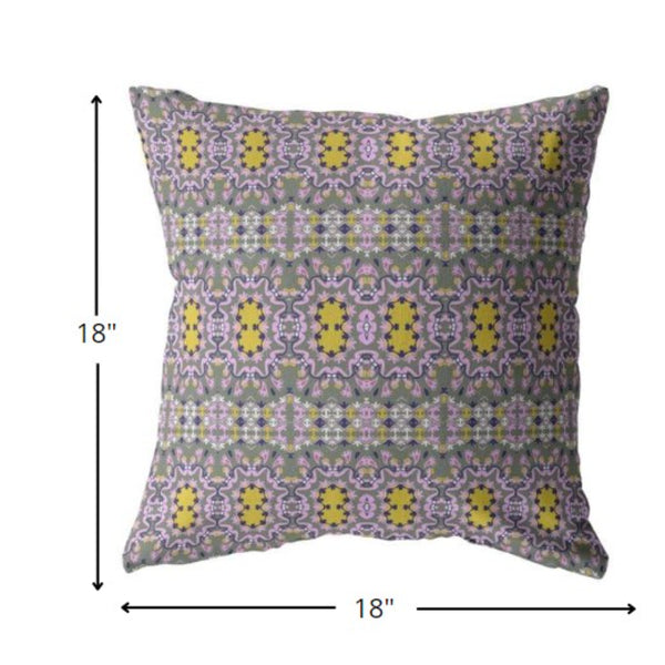The intricacy of the patterns and vibrancy of the palette in this Purple Yellow Geofloral Zippered Suede Throw Pillow is sure to add a feeling of cheerfulness to your living space with a bohemian flair. The floral patterns in pale purple and mustard yellow are geometrically fashioned over a sage green backdrop, making this pillow an eye-catching accent to adorn your boho-chic home. The velvety-soft aesthetic of the eco-friendly suede fabric provides a classy look while ensuring durability for regular use. The premium quality soft polyfill insert makes the blown and closed pillow utterly comfortable with a luxurious feel on the touch. Bring an outstanding lavishness and spectacular vibe into your living room with this colorful decorative throw pillow. 18” x 18” x 5”