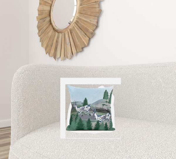 The 18x18 green blue deer blown seam broadcloth animal print throw pillow is the perfect decorative accessory for your home. The green blue coloring of the soft and long lasting broadcloth will look great in most any space. Great to use on its own or mix with other decorations for the perfect look. A great decorative accessory for your favorite chair, to accent your sofa, or to use as part of your bed ensemble. 18" H x 18" W x 5" D