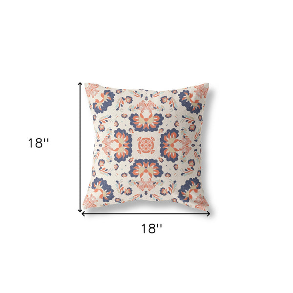 The perfect complement to your sofa, favorite chair, or bed, this 18"x18" off white navy and orange zip broadcloth floral scroll throw pillow is a great decorative accent. This off white and blue colored decorative accessory is made from high grade broadcloth that makes it soft and long lasting. Great to use on its own or mix with other decorations for the perfect look. A great decorative accessory for your favorite chair, to accent your sofa, or to use as part of your bed ensemble. 6" H x 18" W x 18" D