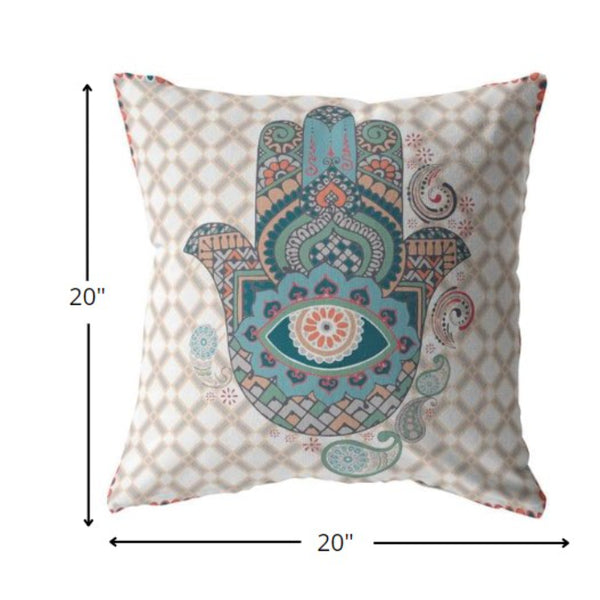 This Blue Gray Hamsa Indoor Outdoor Zippered Throw Pillow will highlight a bohemian spirit in your living space while giving a sense of vibrancy and sophistication at the same time. Centered with an intricately decorative hamsa print in pastel blue and muted orange over a geometric patterned gray and white base, this pillow evokes a sense of tranquility with a bohemian appeal. Made with the finest broadcloth, the pillow boasts longevity and sturdiness, ideal for both indoor and outdoor use. This pillow features 100% polyester fiber filling, which gives the piece a luxurious cushiony feel with a fluffy nature to provide ultimate comfort when you lean on it. You can easily remove the cover for cleaning without any hassle, thanks to the in-built zipper on it. Exhibit a true bohemian look into your living room with this stunning decorative pillow that will work well against any dark-toned décor. 20â x 20â x 5â
