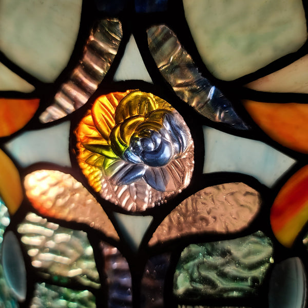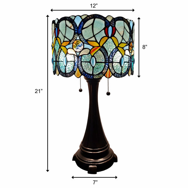 This 21" Tiffany Style Jeweled Floral Drum Table Lamp will add a touch of elegance to your space. The lampshade blends various hues of handcrafted glass pieces with rich jewels to create an elaborate design that will add flair to any home, regardless of its current decor. You can only be left impressed each time you turn on the two featured lights and pull chains for easy control.  The matte brown tone of the fixture complements the multicolored glass shade design. 11" x 22" x 22"