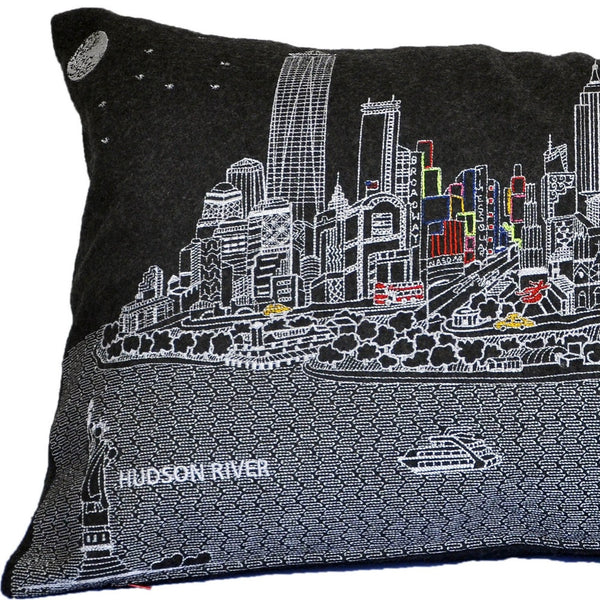 Showcase the most famous city in the world with our Cream Color NYC Nighttime Skyline Standard Size Lumbar Decorative Pillow. The nighttime view of the Hudson River overlooking the “Big Apple” is a modern whimsical way to bring this iconic cityscape to life. Made of a wool/nylon blend, this high quality stitched decorative pillow features white on black artwork mixed with pops of color that highlight important and recognizable icons from this fabulous city. This pillow makes a great gift, decorative accent and conversation piece. 4" x 24" x 14"