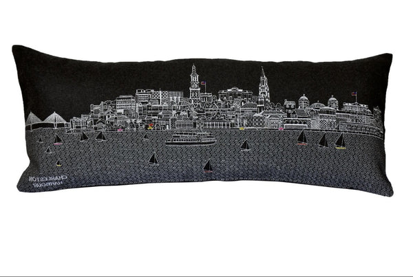 Showcase this famous city, with our Black Color Charleston Nighttime Skyline Prince Size Lumbar Decorative Pillow. The Nighttime view of Charleston from the Harbour, is picture perfect. The gorgeous art features many famous landmarks and references for this destination city, rendering a modern whimsical way to bring this iconic cityscape to life. Made of a wool/nylon blend, this high quality stitched decorative pillow features white on black embroidered artwork mixed with pops of color that highlight important and recognizable icons from this popular South Carolina city. This pillow makes a great gift, decorative accent and conversation piece. 4" x 24" x 14"