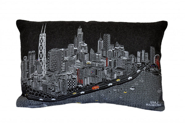 Showcase one of the most famous cities in the world with our Black Color Chicago Nighttime Skyline Prince Size Lumbar Decorative Pillow. This Nighttime view of Chicago from Lake Michigan is a stunning way to represent one of the most beloved cities. Known for it's jazz and considered the birthplace of skyscrapers, the gorgeous art features famous architecture and landmarks rendering a modern whimsical way to bring this iconic cityscape to life. Made of a wool/nylon blend, this high quality stitched decorative pillow features white on black embroidered artwork mixed with pops of color that highlight important and recognizable icons from this fabulous city. This pillow makes a great gift, decorative accent and conversation piece. 4" x 24" x 14"