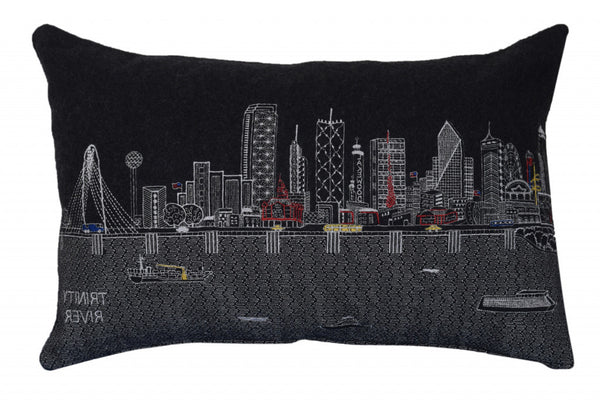 Showcase this famous city, with our Black Color Dallas Nighttime Skyline Prince Size Lumbar Decorative Pillow. The Nighttime view of Dallas from the Trinity River, is picture perfect. The gorgeous art features many famous landmarks and references for this destination city, rendering a modern whimsical way to bring this iconic cityscape to life. Made of a wool/nylon blend, this high quality stitched decorative pillow features white on black embroidered artwork mixed with pops of color that highlight important and recognizable icons from this popular Texas city known for among other things, their beloved Cowboys NFL Team. This pillow makes a great gift, decorative accent and conversation piece. 4" x 24" x 14"
