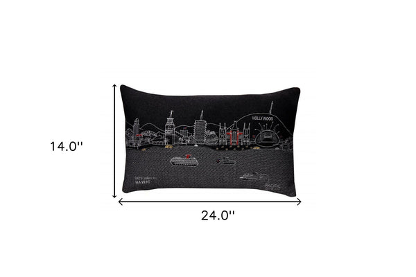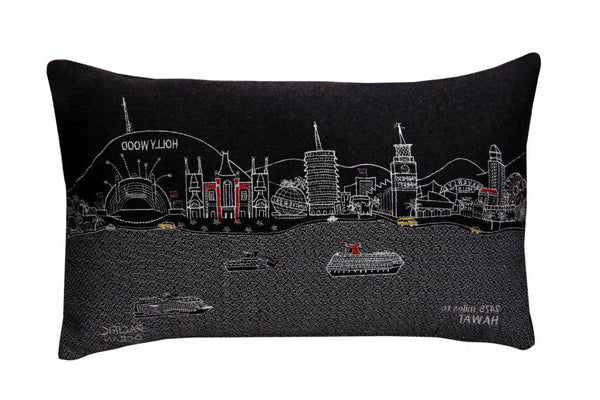 Showcase this world famous city, with our Black Color Los Angeles Nighttime Skyline Prince Size Lumbar Decorative Pillow. The Nighttime view of the Los Angeles from the Pacific, is picture perfect. The gorgeous art features many famous landmarks and references for this destination city including the Hollywood sign and Beverly Hills, rendering a modern whimsical way to bring this iconic city to life. Made of a wool/nylon blend, this high quality stitched decorative pillow features white on black embroidered artwork mixed with pops of color that highlight important and recognizable icons from this popular California city. This pillow makes a great gift, decorative accent and conversation piece. 4" x 24" x 14"