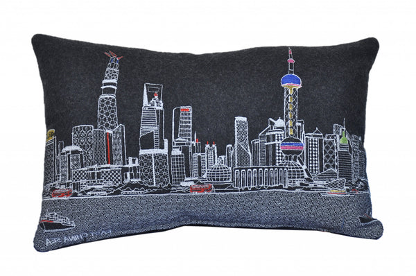 Showcase one of the most famous cities in the world with our Black Color Shanghai Nighttime Skyline Prince Size Lumbar Decorative Pillow. This Nighttime view of Shanghai from the East China Sea, is a stunning way to represent one of the most important and travelled cities in the world. The gorgeous art features famous architecture and landmarks rendering a modern whimsical way to bring this iconic cityscape to life. Made of a wool/nylon blend, this high quality stitched decorative pillow features white on black embroidered artwork mixed with pops of color that highlight important and recognizable icons from this fabulous city. This pillow makes a great gift, decorative accent and conversation piece. 4" x 24" x 14"