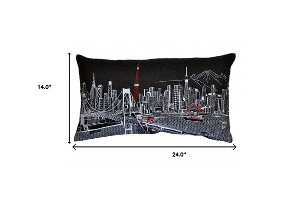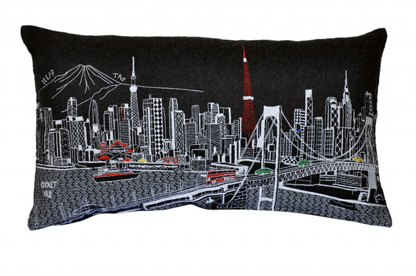 Showcase one of the most famous cities in the world with our Black Color Tokyo Nighttime Skyline Prince Size Lumbar Decorative Pillow. This Nighttime view from Tokyo Bay, is a stunning way to represent one of the most important and visited cities in the world. The gorgeous art features famous architecture and landmarks including Mt. Fuji in the background, rendering a modern whimsical way to bring this iconic cityscape to life. Made of a wool/nylon blend, this high quality stitched decorative pillow features white on black embroidered artwork mixed with pops of color that highlight important and recognizable icons from this fabulous city. This pillow makes a great gift, decorative accent and conversation piece. 4" x 24" x 14"