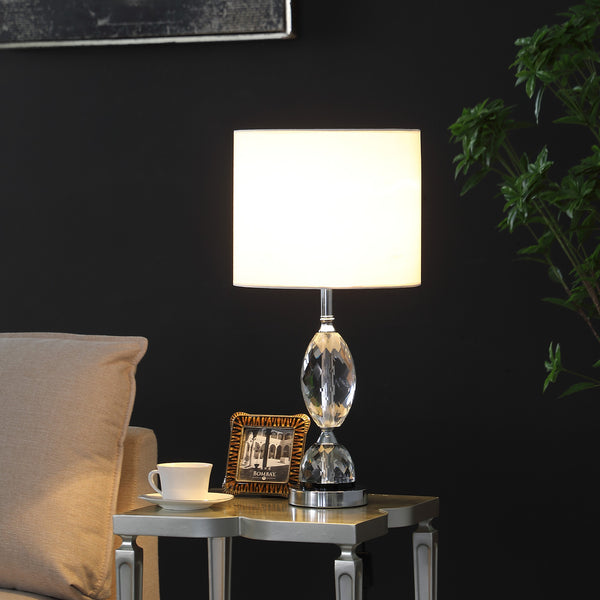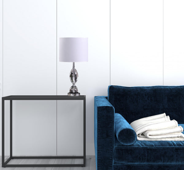 Add a bright anchor to your room with this 24" silver and cut faux crystal cylinder table lamp with white shade. A gorgeous silver metal base bring just the right amount of pizzazz to this fabulous lamp. This standard table lamp is designed to provide general lighting to the area. The light that this lamp throws is soft and warm to elevate the look of most any space in your home. Bring some lite and good vibes into your space with this updated and stylishly designed lamp. 23.5" H x 11.5" W x 11.5" D