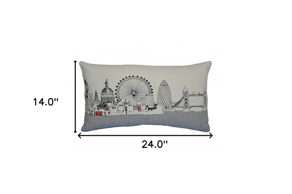 Showcase one of the most famous cities in the world with our Cream Color London Daylight Skyline Queen Size Lumbar Decorative Pillow. This daylight view of London is one of the most famous landscapes in the world. The gorgeous art features famous architecture and landmarks including Big Ben and The London Eye, rendering a modern whimsical way to bring this iconic cityscape to life. Made of a wool/nylon blend, this high quality stitched decorative pillow features black on white embroidered artwork mixed with pops of color that highlight important and recognizable icons from this fabulous city. This pillow makes a great gift, decorative accent and conversation piece. 4" x 24" x 14"