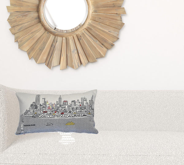 Showcase the most famous city in the world with our Cream Color NYC Daylight Skyline Standard Size Lumbar Decorative Pillow. The daylight view of the Hudson River overlooking the “Big Apple” is a modern whimsical way to bring this iconic cityscape to life. Made of a wool/nylon blend, this high quality stitched decorative pillow features black on white artwork mixed with pops of color that highlight important and recognizable icons from this fabulous city. This pillow makes a great gift, decorative accent and conversation piece. 4" x 24" x 14"