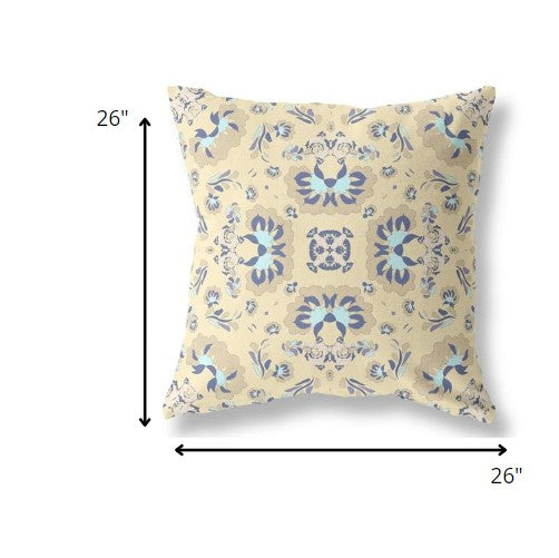 Upholding traditional patterns in a modern palette, this Beige Blue Floral Indoor Outdoor Zippered Throw Pillow will undoubtedly be an element of class and comfort in your living space. The delicate beige-toned base is intricately designed with shades of blue floral motifs, creating a classy combination for visual harmony. Made from high-quality broadcloth fabric that is known for its durability to last long while the smooth surface texture offers a characteristic sheen. Ideal for both indoor and outdoor usage, this pillow is filled with 100% polyester fiber insert for a plush feel and extra fluffiness, which makes it a great accent piece for style and comfort. The zippered closure adds to a seamless finish and makes the cover easy to remove and clean. Pair this beautiful pillow against dark-toned décor and it will uplift the aesthetics of any modern or contemporary living space with striking contrast. 26” x 26” x 6”
