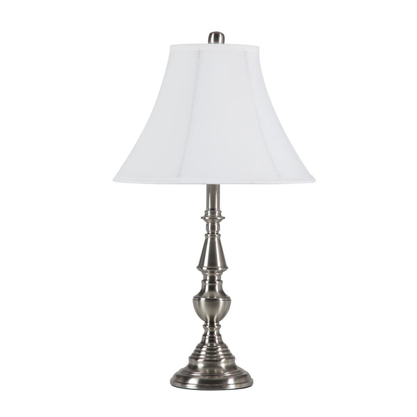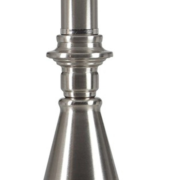 Beautify and light up your home with this 26” Traditional Brushed Nickel Metal Table Lamp. It is made from high quality silver nickel metal and a cotton/linen blend, ensuring that the lamp is string, sturdy, and very durable. The lamp features a traditional candlestick body with a shiny silver nickel finish and a white empire lampshade to complement the silver of the body. This is a statement piece that would fit perfectly in your living room or dining room. 25.5” x 15” x 15”