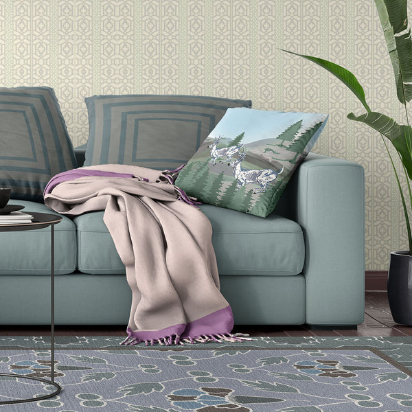 Unique and decorative, this comfortable 26x26 green blue deer blown seam broadcloth animal print throw pillow will leave a lasting impression. The green blue coloring of the soft and long lasting broadcloth will look great in most any space. Makes a perfect decorative addition for anyone who loves a stylish look and feel. You can be certain that you'll be leaving an impression with this unique piece. 26" H x 26" W x 5" D