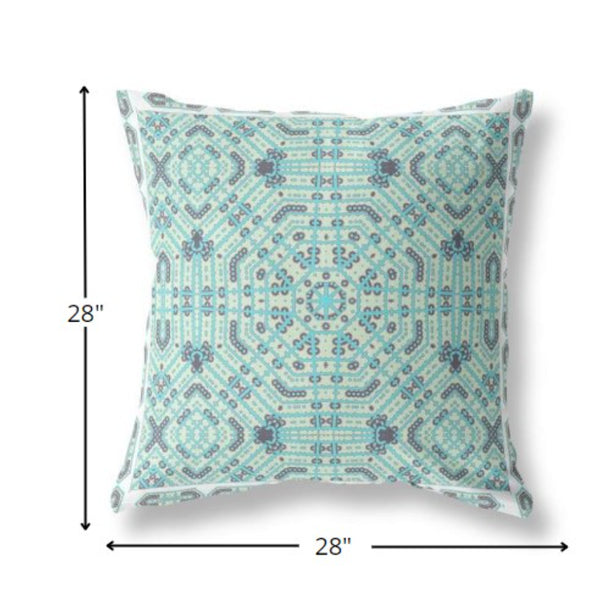 Capture the serenity of the ocean with Aqua Geostar Indoor Outdoor Throw Pillow that features an eye-soothing palette to induce a relaxing ambiance into your living space. The intricate geometric detailing in soft shades of blue and aqua accentuates a stunning star pattern, giving this pillow a refreshing tone with a bohemian flair. Skillfully crafted with top-notch quality broadcloth fabric, this decorative pillow is sturdy yet soft with a smooth surface texture which is ideal for both indoor and outdoor use. This blown and closed pillow sports a durable polyfill insert which contributes to the luxurious fluffy look and cushiony feel, making it an excellent piece of class and comfort. To give your boho-chic home a fresh new update, go for this beautiful decorative pillow that will work well with both bright and bold-toned decors. 28” x 28” x 5”