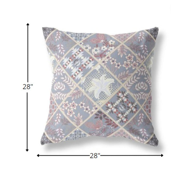 Embrace a classic-modern vibe into your living space with this beautifully designed Gray Pink Patch Indoor Outdoor Throw Pillow. The cool-toned gray patches are adorned with eclectic floral patterns in cream, white, and mauve-pink to create an elegant piece of art on the surface for visual intrigue. Artfully crafted with the finest broadcloth material, the pillow is durable and robust with a silky smooth texture, ideal for indoor and outdoor settings. This blown and closed pillow comes with a 100% polyester filling insert, making it soft and plush to the feel with its added fluffiness. If you want a stylish accent piece in the room with a traditional core, this decorative pillow will be the perfect piece to update your boho-chic interior. Generous in size, this large pillow measures 28” x 28” x 5”.