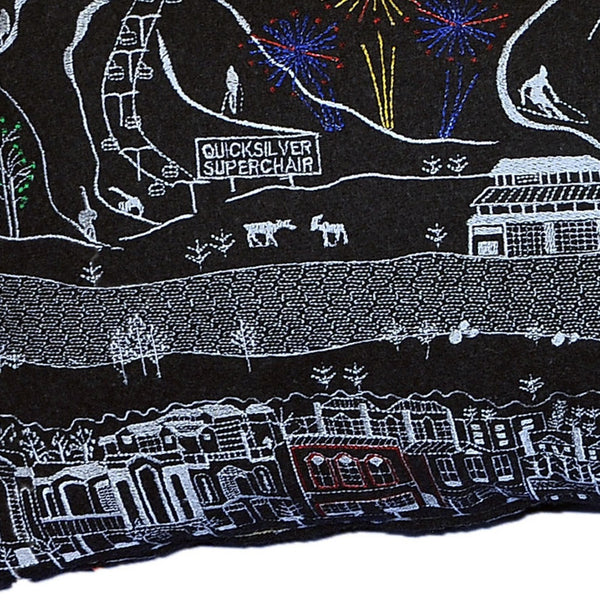 Showcase this famous city, with our Black Color Breckenridge Nightylight Skyline Queen Size Lumbar Decorative Pillow. The Nighttime view of Breckenridge is picture perfect. The gorgeous art features many famous landmarks and references for this destination city, rendering a modern whimsical way to bring this iconic cityscape to life. Made of a wool/nylon blend, this high quality stitched decorative pillow features white on black embroidered artwork mixed with pops of color that highlight important and recognizable icons from this popular Colorado city known for its snow sports, fine dining, and resorts. This pillow makes a great gift, decorative accent and conversation piece. 4" x 35" x 14"