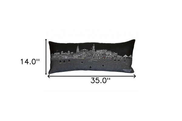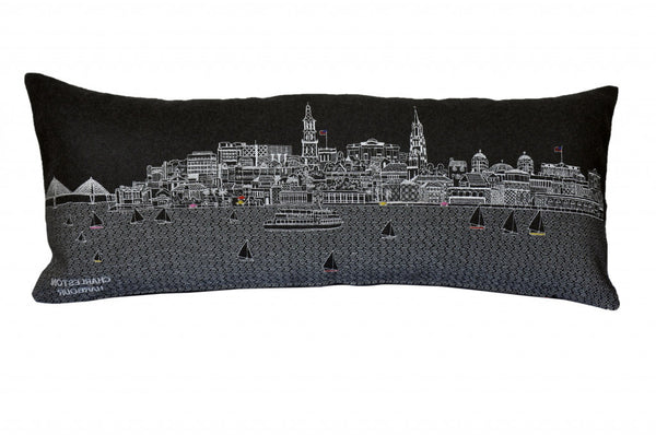 Showcase this famous city, with our Black Color Charleston Nighttime Skyline Queen Size Lumbar Decorative Pillow. The Nighttime view of Charleston from the Harbour, is picture perfect. The gorgeous art features many famous landmarks and references for this destination city, rendering a modern whimsical way to bring this iconic cityscape to life. Made of a wool/nylon blend, this high quality stitched decorative pillow features white on black embroidered artwork mixed with pops of color that highlight important and recognizable icons from this popular South Carolina city. This pillow makes a great gift, decorative accent and conversation piece. 4" x 35" x 14"
