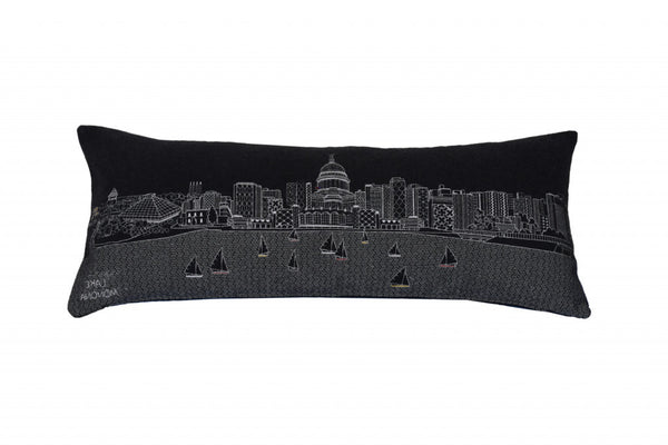Showcase this famous city, with our Black Color Madison Nighttime Skyline Queen Size Lumbar Decorative Pillow. The Nighttime view of the Madison, is picture perfect. The gorgeous art features many famous landmarks and references for this destination city, rendering a modern whimsical way to bring this iconic city to life. Made of a wool/nylon blend, this high quality stitched decorative pillow features white on black embroidered artwork mixed with pops of color that highlight important and recognizable icons from this popular city. This pillow makes a great gift, decorative accent and conversation piece. 4" x 35" x 14"