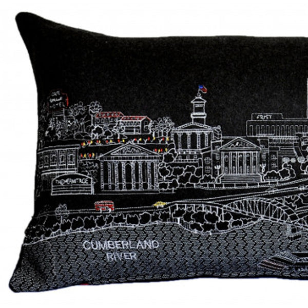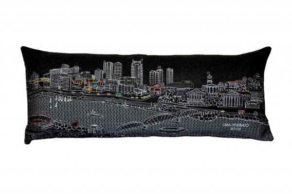 Showcase this famous city, with our Black Color Nashville Nighttime Skyline Queen Size Lumbar Decorative Pillow. The Nighttime view of the Nashville shore line from the Cumberland River is picture perfect. The gorgeous art features many famous landmarks and references for this city famous for Country Music, rendering a modern whimsical way to bring this iconic cityscape to life. Made of a wool/nylon blend, this high quality stitched decorative pillow features white on black embroidered artwork mixed with pops of color that highlight important and recognizable icons from this fabulous city. This pillow makes a great gift, decorative accent and conversation piece. 4" x 35" x 14"