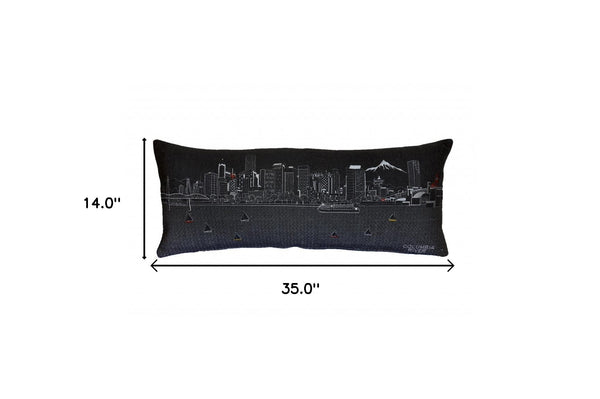 Showcase this famous city, with our Black Color Portland Nighttime Skyline Queen Size Lumbar Decorative Pillow. The Nighttime view of the Portland from the Columbia River is picture perfect. The gorgeous art features many famous landmarks and references for this destination city, rendering a modern whimsical way to bring this iconic city to life. Made of a wool/nylon blend, this high quality stitched decorative pillow features white on black embroidered artwork mixed with pops of color that highlight important and recognizable icons from this popular Oregon city. This pillow makes a great gift, decorative accent and conversation piece. 4" x 35" x 14"
