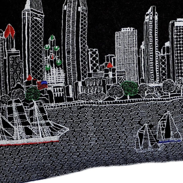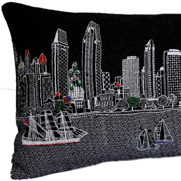 Showcase this famous city, with our Black Color San Diego Nighttime Skyline Queen Size Lumbar Decorative Pillow. The Nighttime view of the San Diego is picture perfect. The gorgeous art features many famous landmarks and references for this destination city, rendering a modern whimsical way to bring this iconic city to life. Made of a wool/nylon blend, this high quality stitched decorative pillow features white on black embroidered artwork mixed with pops of color that highlight important and recognizable icons from this popular Calfifornia coastal city. This pillow makes a great gift, decorative accent and conversation piece. 4" x 35" x 14"