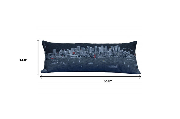 Showcase this famous city, with our Black Color Seattle Nighttime Skyline Queen Size Lumbar Decorative Pillow. The Nighttime view of the Seattle shoreline from the Eliot Bay is picture perfect. The gorgeous art features many famous landmarks and references for this revered Pacific Coast city, rendering a modern whimsical way to bring this iconic cityscape to life. Made of a wool/nylon blend, this high quality stitched decorative pillow features white on black embroidered artwork mixed with pops of color that highlight important and recognizable icons from this fabulous city. This pillow makes a great gift, decorative accent and conversation piece. 4" x 35" x 14"