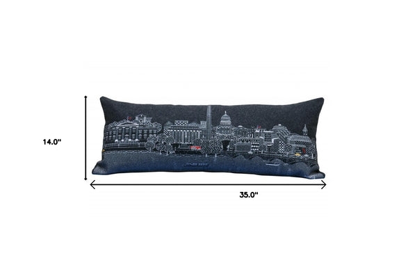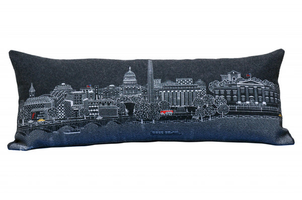 Showcase this famous city, with our Black Color Washington DC Nighttime Skyline Queen Size Lumbar Decorative Pillow. The Nighttime view of Washington DC from the Potomac River, is picture perfect. The gorgeous art features many famous landmarks and references for this destination city inclduing of course the White House and National Monument among others, rendering a modern whimsical way to bring this iconic cityscape to life. Made of a wool/nylon blend, this high quality stitched decorative pillow features white on black embroidered artwork mixed with pops of color that highlight important and recognizable icons from this popular and historic city. This pillow makes a great gift, decorative accent and conversation piece. 4" x 35" x 14"