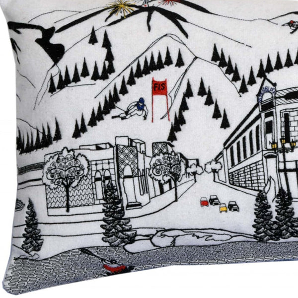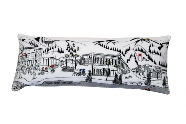 Showcase this famous city, with our Cream Color Aspen Daylight Skyline Queen Size Lumbar Decorative Pillow. The daylight view of Aspen from the Roaring Fork River is picture perfect. The gorgeous art features many famous landmarks and references for this destination city, rendering a modern whimsical way to bring this iconic cityscape to life. Made of a wool/nylon blend, this high quality stitched decorative pillow features black on white embroidered artwork mixed with pops of color that highlight important and recognizable icons from this popular Colorado city known for its snow sports, fine dining, and resorts. This pillow makes a great gift, decorative accent and conversation piece. 4" x 35" x 14"