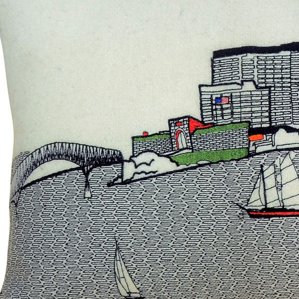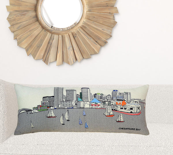 Showcase this famous city, with our Cream Color Baltimore Daylight Skyline Queen Size Lumbar Decorative Pillow. The daylight view of Baltimore Inner Harbor from the Chesapeake Bay, is picture perfect. The gorgeous art features many famous landmarks and references for this destination city, rendering a modern whimsical way to bring this iconic cityscape to life. Made of a wool/nylon blend, this high quality stitched decorative pillow features black on white embroidered artwork mixed with pops of color that highlight important and recognizable icons from this popular Maryland city. This pillow makes a great gift, decorative accent and conversation piece. 4" x 35" x 14"