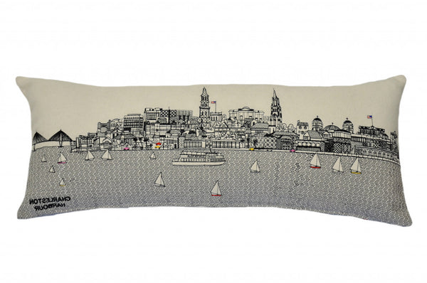 Showcase this famous city, with our Cream Color Charleston Daylight Skyline Queen Size Lumbar Decorative Pillow. The daylight view of Charleston from the Harbour, is picture perfect. The gorgeous art features many famous landmarks and references for this destination city, rendering a modern whimsical way to bring this iconic cityscape to life. Made of a wool/nylon blend, this high quality stitched decorative pillow features black on white embroidered artwork mixed with pops of color that highlight important and recognizable icons from this popular South Carolina city. This pillow makes a great gift, decorative accent and conversation piece. 4" x 35" x 14"