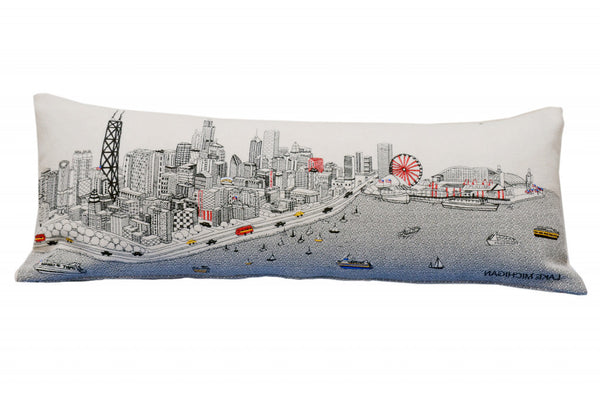 Showcase one of the most famous cities in the world with our Cream Color Chicago Daylight Skyline Queen Size Lumbar Decorative Pillow. This daylight view of Chicago from Lake Michigan is a stunning way to represent one of the most beloved cities. Known for it's jazz and considered the birthplace of skyscrapers, the gorgeous art features famous architecture and landmarks rendering a modern whimsical way to bring this iconic cityscape to life. Made of a wool/nylon blend, this high quality stitched decorative pillow features black on white embroidered artwork mixed with pops of color that highlight important and recognizable icons from this fabulous city. This pillow makes a great gift, decorative accent and conversation piece. 4" x 35" x 14"