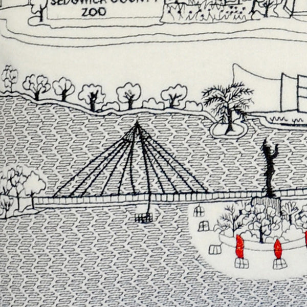 Showcase this famous city, with our Cream Color Wichita Daylight Skyline Queen Size Lumbar Decorative Pillow. The daylight view of Wichita, is picture perfect. The gorgeous art features many famous landmarks and references for this destination city, rendering a modern whimsical way to bring this iconic city to life. Made of a wool/nylon blend, this high quality stitched decorative pillow features black on white embroidered artwork mixed with pops of color that highlight important and recognizable icons from this popular and bustling city. This pillow makes a great gift, decorative accent and conversation piece. 4" x 35" x 14"