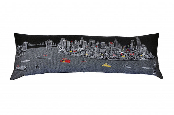 Showcase one of the most famous cities in the world with our Cream Color NYC Nighttime Skyline King Size Lumbar Decorative Pillow. The daylight view of the island of New York City from the river is one of the most famous landscapes in the world. The gorgeous art features many famous landmarks including The Empire State Building, Broadway, and Times Square, rendering a modern whimsical way to bring this iconic cityscape to life. Made of a wool/nylon blend, this high quality stitched decorative pillow features white on black embroidered artwork mixed with pops of color that highlight important and recognizable icons from this fabulous city. This pillow makes a great gift, decorative accent and conversation piece. 4" x 45" x 14"